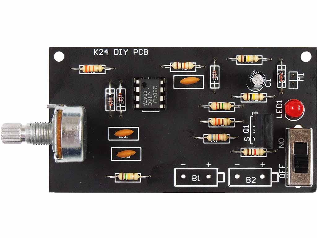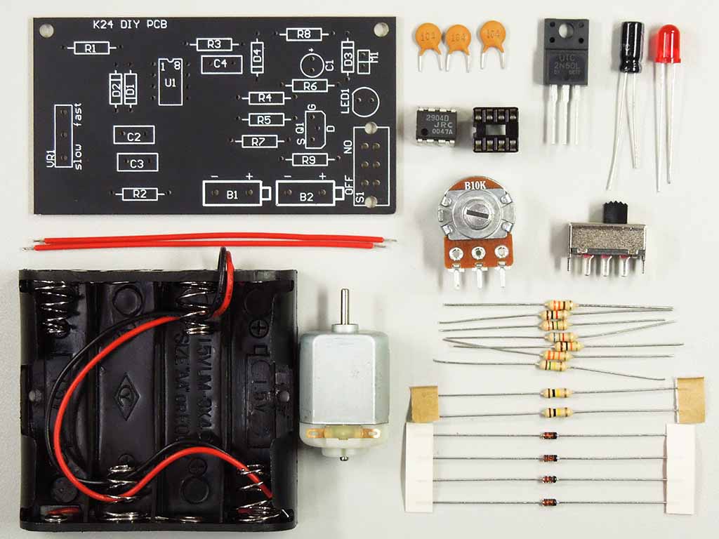 簡単なスピードコントローラーキットです。DCモーターが1個付属します。電源は単3電池4本(別売)を使用し、約5~6Vで動作します。マンガンまたはアルカリ電池の使用を推奨します。充電池では電圧不足で作動しない場合があります。説明書は英語と中国語で記載されています。模型などに使われるマブチモーター(普通のブラシ付きDCモーター)用です。ステッピングモーターは使用できません。VRは反時計回りでスピードが速くなります(反対に取り付けることを推奨)。モーターの回転方向は固定で、逆回転やブレーキ機能はありません。