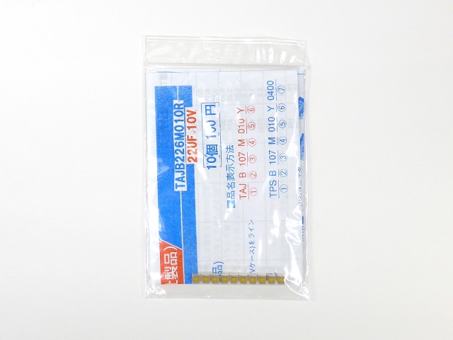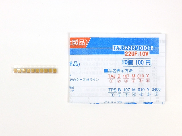 AVX社の表面実装型タンタルコンデンサです。茶色のマーク(帯)側がプラス極です。