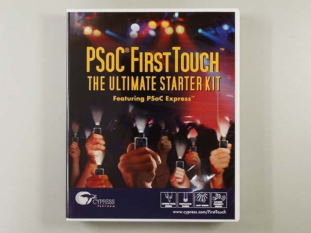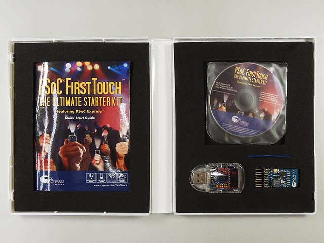 サイプレス純正のPSoCスターターキットです。USB接続で静電容量センサ、近接センサ、光センサ、温度センサのデモが簡単に行えます。導入ガイドは日本語ですが、ソフトウェアは英語です。CD-ROMは8cmシングルCD。