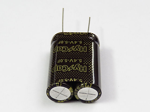 超大容量の電気二重層コンデンサー。充電池の代替となる蓄電部品として、小型大容量かつ電圧保持特性に優れています。等価直列抵抗が低く大電流充放電が可能で、バッテリーと比較して長寿命、短い充放電サイクルに有効です。10Fx2を直列接続し耐圧を5.4Vにした特殊品。