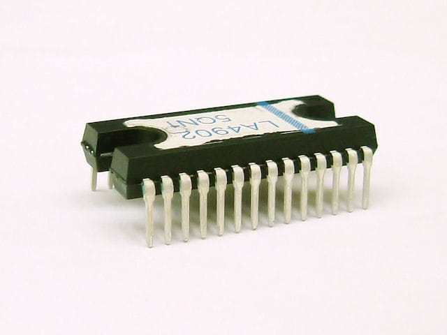 三洋の10W BTLオーディオパワーアンプICです。信号追従型スイッチング方式電源とノンリニアアンプを搭載し、外付け部品を削減、消費電力を低減します。DIP28H(500mil)パッケージ。 ※2.54mmピッチ基板には斜めに差し込むことで対応可能です。