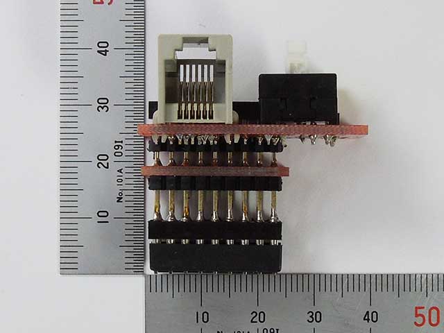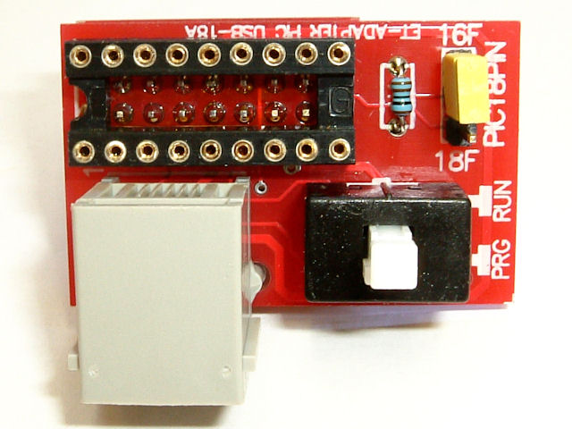 AKI-PIC2用の18ピンDIPパッケージマイコン向けアダプターです。マイコンをアダプターに装着し、ターゲット基板に差し込んで使用します。ターゲット基板に付けたまま書き込み可能で、スイッチでPGM/RUNを切り替えられます。