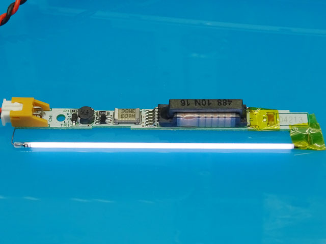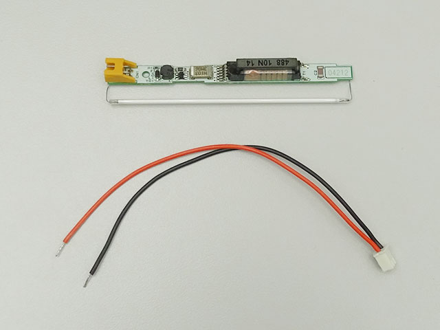 極細冷陰極管付きのインバーターユニットです。超小型の蛍光灯のような製品で、完全な白色発光(6500K)のため、カラーセロファンやマジックインクで様々な色を作成できます。装飾照明、線光源、トレース台光源に最適です。付属品:電源ケーブル(150mm長、片端はんだメッキ仕上げ)