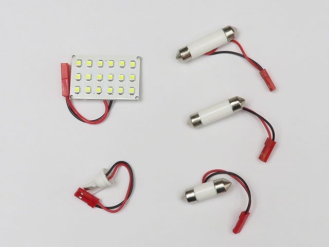 車用のルームランプセットです。 3x6=18個のチップ白色LEDが明るく光ります。 LED部分は裏に両面テープがついています 。 また各車に合うよう変換アダプタがついています。 発光色:白色 ◆内容物 ・ルームランプ本体 ・31mm用アダプター ・37mm用アダプター ・42mm用アダプター ・T10用アダプター 豆電球用アダプターは付かなくなりました、付属品は写真に写っているものがすべてになります。