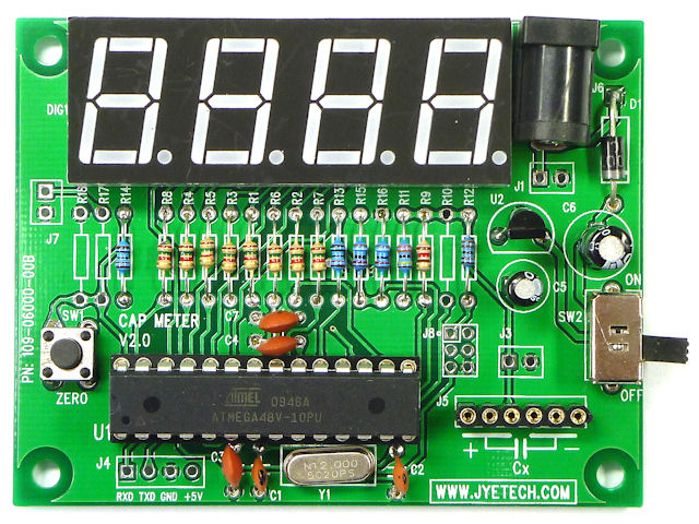 アトメル(ATMEL)のマイコンを使用したデジタル容量計キットです。マイコンを使用しているため、部品点数が少なくなっています。マイコンはプログラム書込済。キット専用基板を使用し、各部品をはんだ付けするだけで完成します。 ■部品構成:マイコン、IC、水晶、LED、ダイオード、コンデンサ、抵抗など ■使い方: 1. 高電圧で充電されたコンデンサは放電してください。 2. 電源を入れ、測定端子にコンデンサを接続します。 3. 左の押しボタンスイッチでゼロ調整します。 4. 単位表示:p…pF, n…nF, u…μF ※マニュアルは英語です。 ※抵抗は小さくカラーコードが読みにくい場合があるため、テスターで値を確認しながら取り付けてください。 ※DCジャックは内径2.1mm、外径5.5mmのプラグに対応します。 ※基板の色は青色です。 ※R10、R17、R18、J7は付属していませんが、設計上の仕様であり、動作に問題ありません。