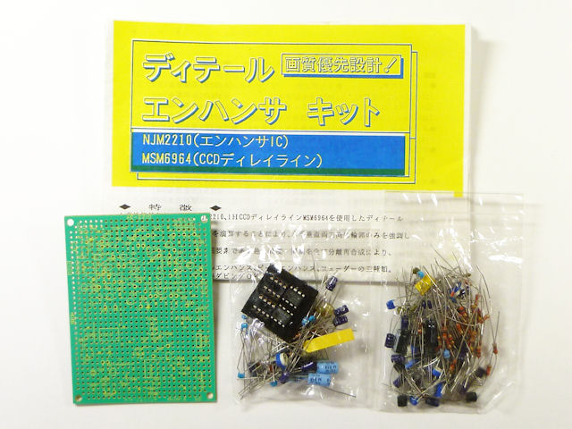 高性能な輪郭補正IC(NJM2210)と1HCCDディレイライン(MSM6964)を使用したディティールエンハンサーキットです。現在の信号と1H前の信号を演算することで、水平・垂直方向の輪郭を強調しノイズを低減します。NTSCコンポジット信号の色、輝度、同期を分離合成することでクリアなエンハンス効果を実現。ディテールエンハンス、ピークエンハンス、フェーダーの3種類のコントロールと、2系統の出力端子を装備しており、同時ダビングやモニター出力が可能です。電源は12V/150mA以上を推奨。このキットはディスクリート構成のため、部品点数と工程数が多めです。