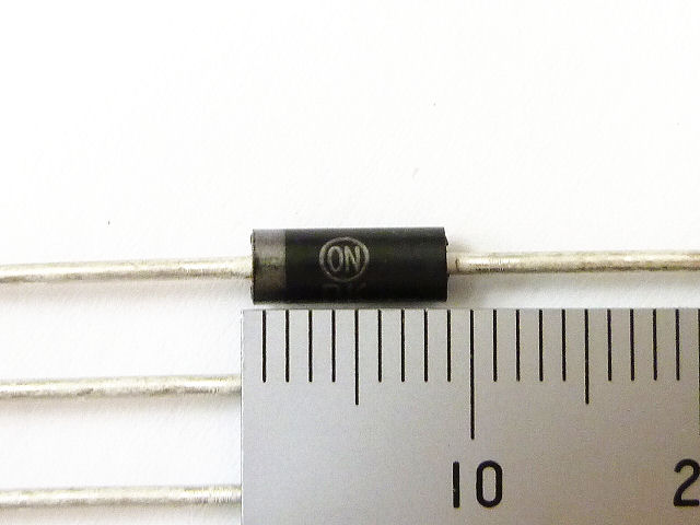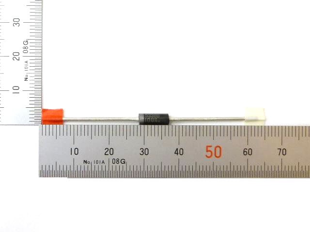 ツェナーダイオードは、逆方向に接続してツェナー降伏またはアバランシェ降伏を利用し、安定した電圧を得るためのダイオードです。安定化回路の基準電圧源、定電流回路、ノイズ吸収、サージ保護などに使用されます。三端子レギュレータと比較して部品点数を削減できるため、簡易的な電源としても利用可能です。ガラス封止、DO-41パッケージで、特性が揃っています。1Wの損失で最大出力電流160mA程度まで取り出せます。