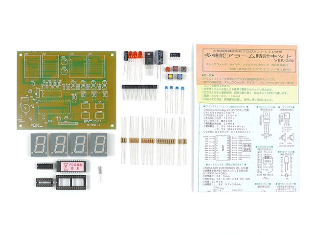 多機能デジタル時計キット。デジタル時計としてだけでなく、インテリアとしても楽しめるように部品がレイアウトされています。