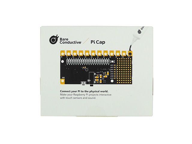 PiCapは、ラズベリーパイ用の拡張ボードです。12個の静電容量式タッチセンサー、アナログオーディオ出力、RGB LED、押しボタンスイッチを搭載しています。導電性塗料を使った実験に最適です。