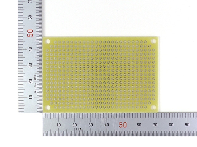 名刺に近いサイズのガラスエポキシユニバーサル基板です。人気のC基板サイズで最もよく売れている中の一つです。手ごろな大きさでちょっとした試作や実験にご好評を頂いております。高品質ガラスエポキシ(FR-4)製でガラス繊維を編んだものにエポキシ樹脂をしみこませたものとなっております。米国の標準化団体のNEMAが規定したCuを貼った積層板の耐熱性グレードで、4番目になっているものです。