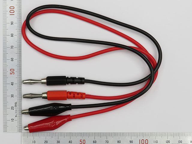 テスターの測定端子をミノムシクリップで引き出すコード。テスターリードを手で押さえ続ける必要がなく、長時間の計測に便利です。連続計測時間に制約がある測定器では、その範囲内でご使用ください。ご使用前に導通チェックを行ってください。