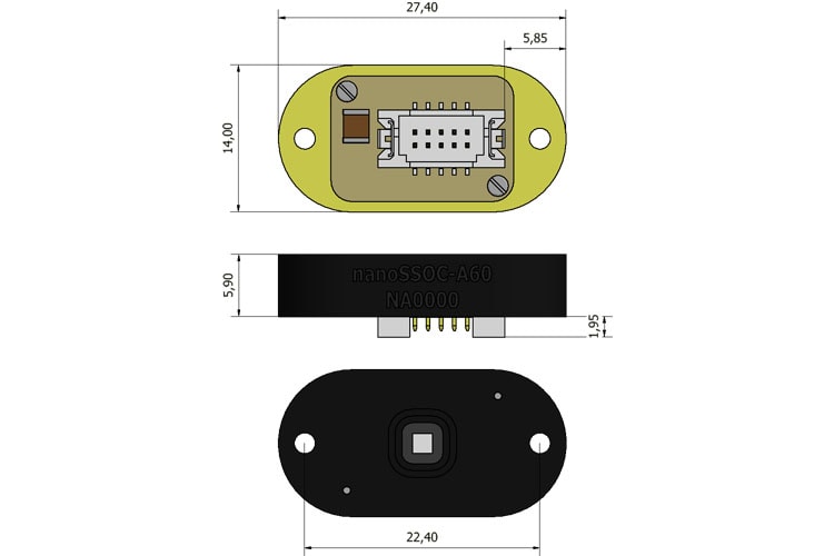 Solar MEMS Sun Sensor on a Chip (SSOC) ソリューションは、高精度な太陽追尾、ポインティング、姿勢決定のための、2軸で低コストの太陽センサーです。このデバイスは、2つの直交軸における太陽光の入射角を測定し、設計の幾何学的寸法に基づいて高い感度を提供します。 NanoSSOC-A60 太陽センサーは、高度に統合されたセンシング構造を実現するために、MEMS製造プロセスに基づいています。nanoSSOC-A60 はアナログインターフェースを備え、コンパクト、軽量、低電力であるため、ナノサテライトプラットフォームに最適です。 NanoSSOC-A60 太陽センサーには、フライトヘリテージを持つ MEMS 技術と、宇宙グレードの電子部品が含まれています。2016 年以来、数百個のユニットが軌道上に存在します。 nanoSSOC-A60 太陽センサーの主な機能は次のとおりです: 技術仕様 CADファイル 説明 技術仕様 黒色アルマイト (ECSS-Q-ST-70-03C) パラメータ: 値: コメント 角度読み取り センサータイプ: 2軸: 直交 視野 (FOV): ± 60°: 性能視野 除外FOV: ± 75: 障害物や反射面がないこと (推奨) 精度: < 0.5°: 3σ 誤差 精度: < 0.1°: 電気的特性 供給電圧: 3.3 V: 要望に応じて 5V 平均消費電力: < 0.1 mA: 暗闇 平均消費電力: < 2 mA: 光: 1360 W/m², Am0 熱的特性 温度範囲: – 30 ~ +85° C: 機械的特性 寸法 (L x W x H): 27.4 x 14 x 5.9 mm: 重量: 3.7 g: 取り付け穴: M2.5 x2 コネクタ: DF13EA-10DP-1.25V(55): Hirose製 ハウジング: アルミニウム 6082: Alodine 1200S (ECSS-Q70-71) 黒色アルマイト (ECSS-Q-ST-70-03C) 認定 総照射線量: > 100kRad: ガンマ線 ビームエネルギー: 6 MeV: プロトンビーム ランダム振動: 14,1g @ 20-2000 Hz 衝撃: 3000 g @ 1 – 100 ms: