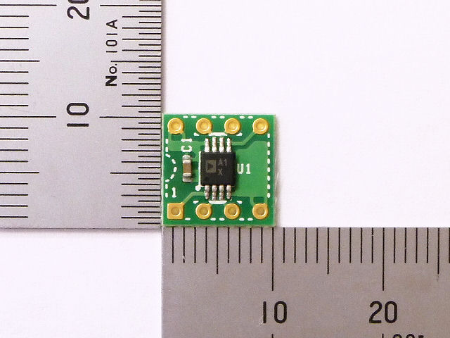 使いやすいDIPモジュールに実装された2回路入りオペアンプAD8506ARMZです。電源端子には0.1μFの積層セラミックコンデンサが実装されています。単電源動作、入出力ともにレール・ツー・レールで、低電圧回路での使用に最適です。
